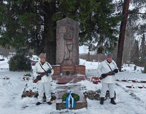 Reserviupseerit ovat järjestäneet kunniavartiot myös Lohilahden kirkon hautausmaalla sinne haudattujen sodassa kaatuneiden lohilahtelaisten muistomerkillä. Mukana on ollut myös nuoria, kuten tässä kuvassa alikersantti Noora Sinkkonen ja korpraali Ilmari Sinkkonen. Kuva Tarja Torvinen